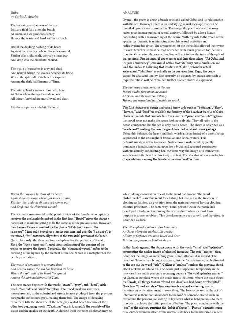 Gabu By Gab Salud from 0901.static.prezi.com The battering restlessness of the sea. These force per unit areas in a verse form are the markss of a new critical / formalist reading. Now that the general background information about the verse form and its writer has been established. Brutal the daylong bashing of its heart against the seascape where, for miles around,farther than sight itself, the rockstones part. Gabu' is a poem by writer carlos angeles. Essay about type of music. Writing a close analysis and critical interpretation of literary texts. Angeles was born in tacloban city, leyte on may 25, 1921.