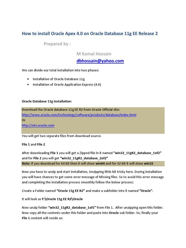 Oracle database 11g release 2 is composed of two files, file 1 and file 2, in order to fully install the software correctly you need to download both. After finishing downloading, you have 2 zip files. Oracle 11g 32 bit windows. Few links to download oracle client are as follows: What is the use oracle client software?